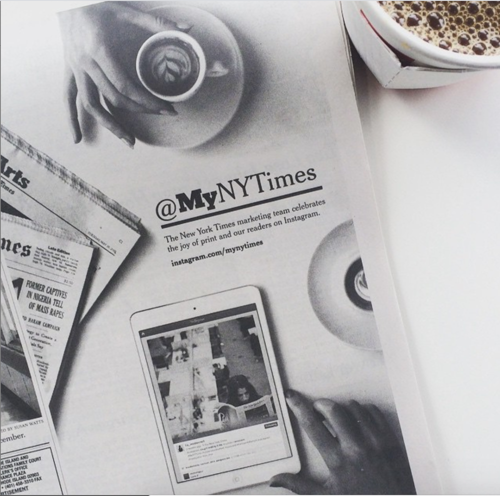 At The New York Times, I initiated a new Instagram handle, @mynytimes, capitalizing on the existing user trend of photography highlighting the print newspaper in beautiful, relatable scenarios to increase sales of the newspaper among a young audience. As part of the marketing effort, I conceptualized and led a series of pop-up coffee giveaways across New York City, marketed through print advertisements I photographed and creatively directed for the newspaper.